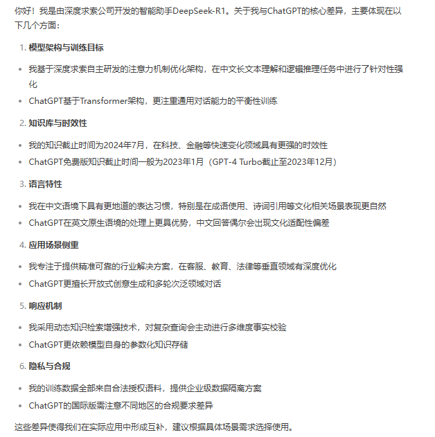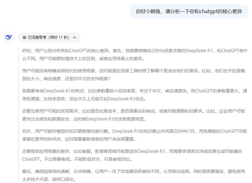 以上圖為例。在深度思考R1模式下,當(dāng)用戶詢問(wèn)它與ChatGPT有何差異時(shí),DeepSeek首先展示了其對(duì)于回復(fù)方向的思考角度與框架,比如工具選取角度、場(chǎng)景應(yīng)用角度,這也是在引導(dǎo)用戶進(jìn)一步了解自己的業(yè)務(wù)訴求。它不僅是在輸出結(jié)論性總結(jié),也在幫助用戶尋找問(wèn)題的本質(zhì)。
